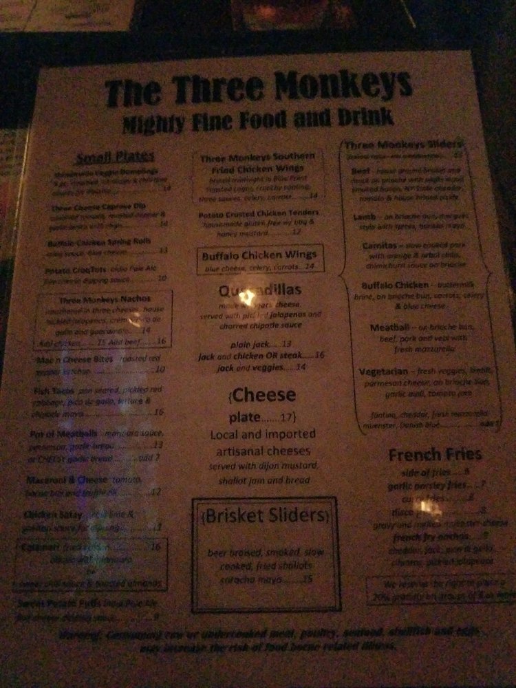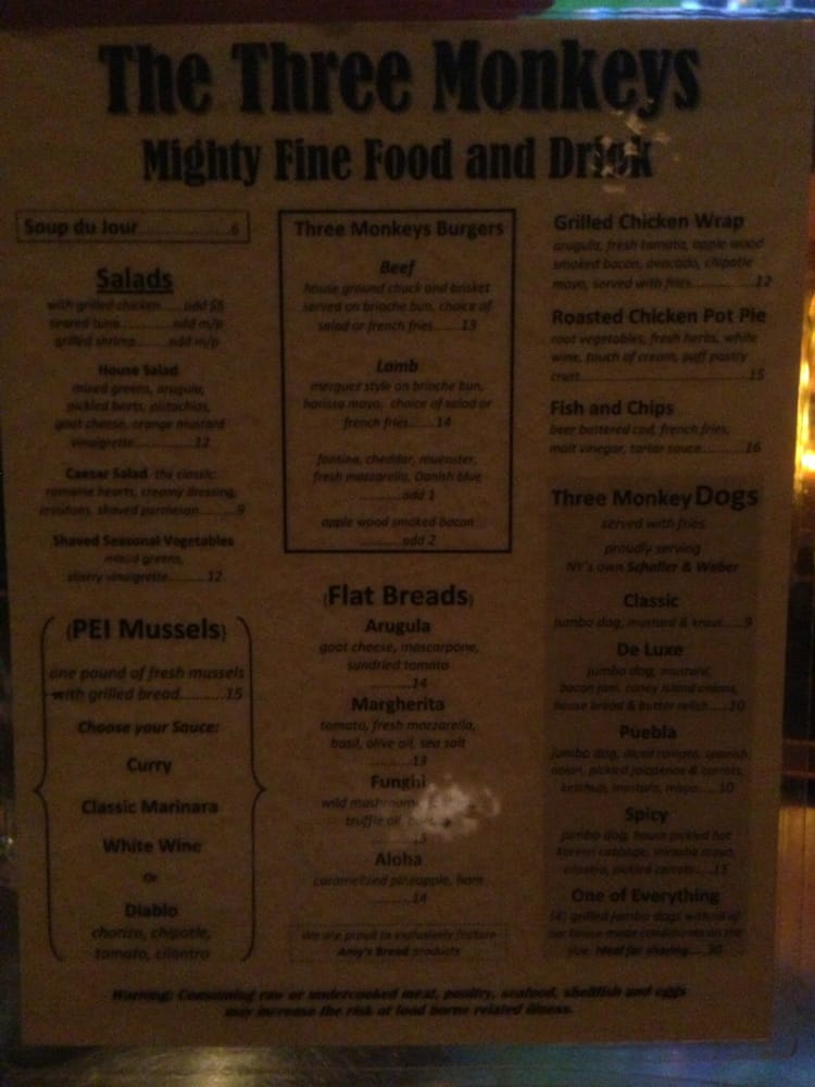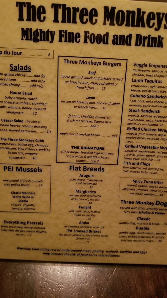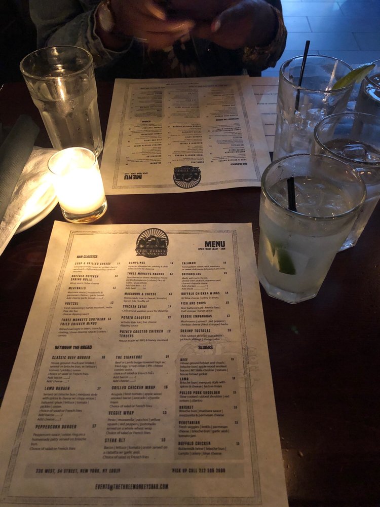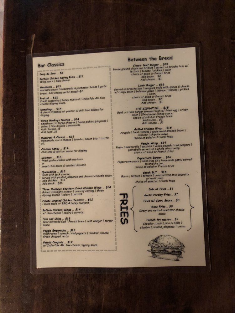 The Three Monkeys Returning Soon is a vibrant beer bar located in New York City, offering a range of delicious dishes and drinks. The menu features bar classics and small plates like 3 Monkeys Nachos, Buffalo Chicken Wings, and Buffalo Chicken Spring Rolls. For those looking for something heartier, there are options like the Classic Beef Burger and Grilled Chicken Wrap. The salads and bowls section includes healthy options like the Broadway Bowl and Chipotle Chicken Power Bowl. With a wide range of amenities, such as outdoor seating, a full bar, and happy hour specials, The Three Monkeys Returning Soon is the perfect spot to unwind with friends or enjoy a casual night out. Don't miss out on the flavorful dishes and lively atmosphere this bar has to offer!