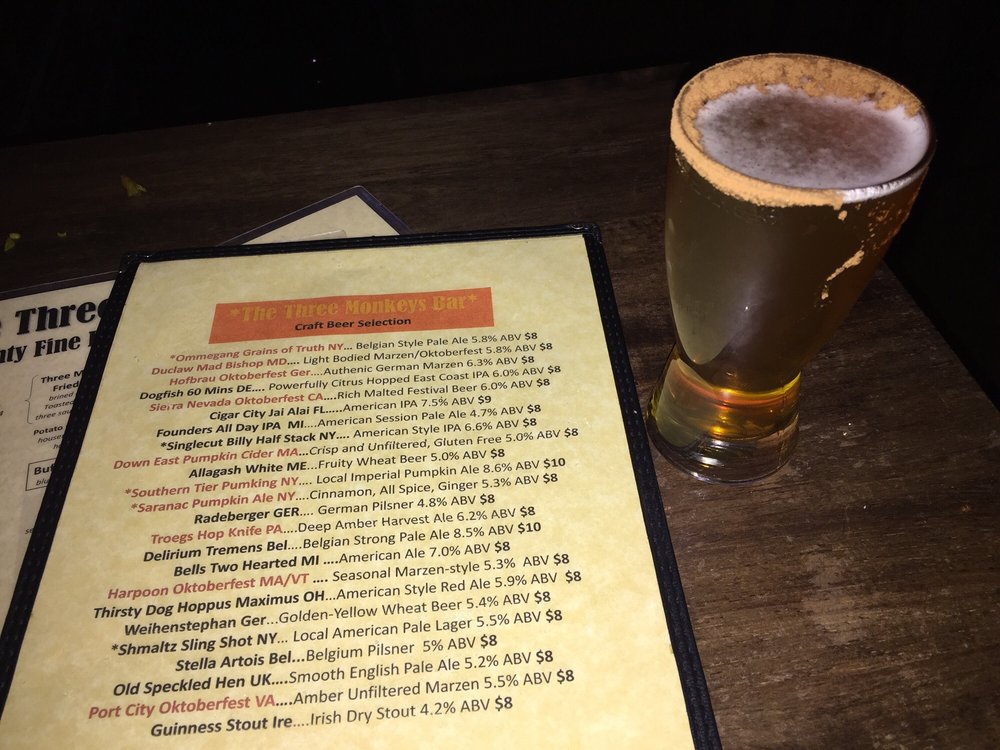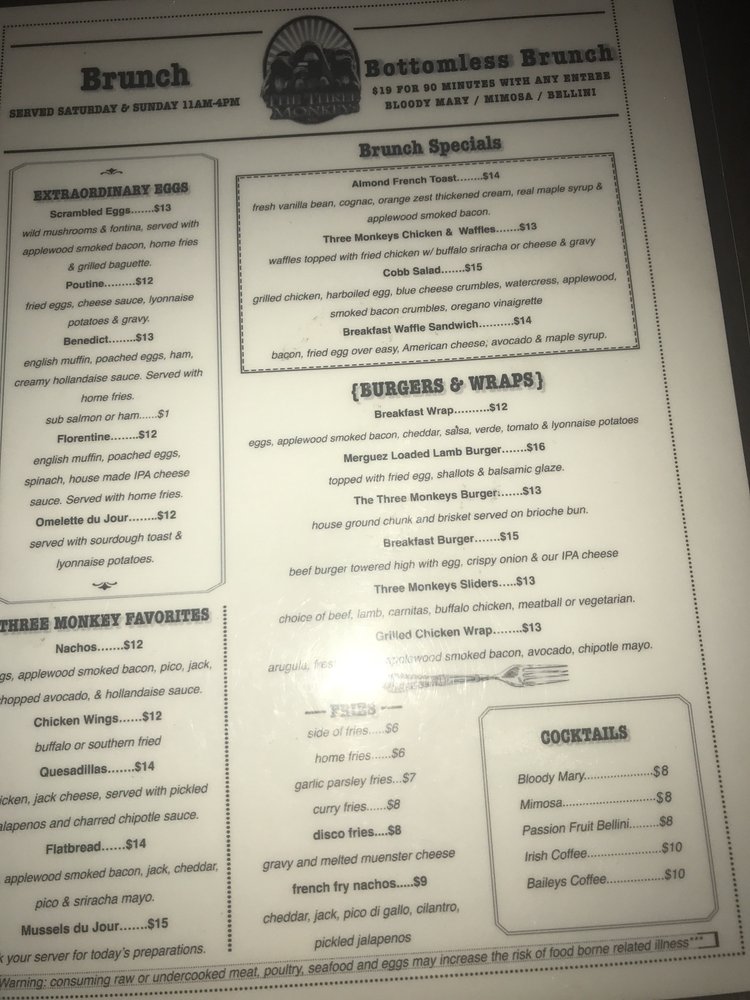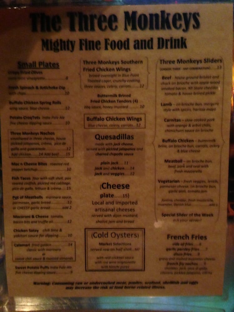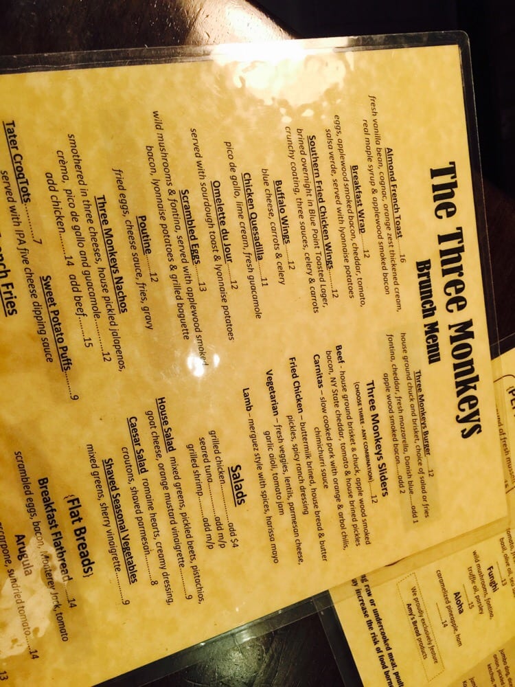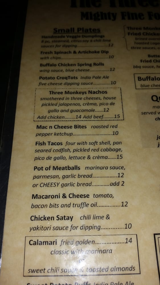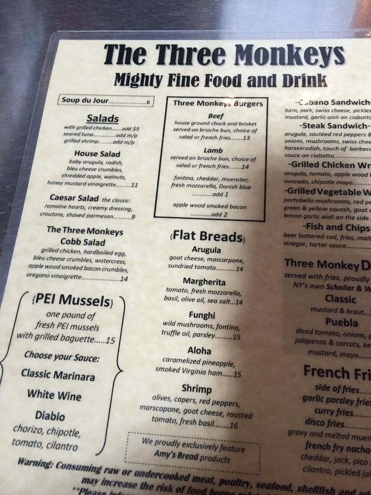 The Three Monkeys Returning Soon is a vibrant beer bar located in New York City, offering a range of delicious dishes and drinks. The menu features bar classics and small plates like 3 Monkeys Nachos, Buffalo Chicken Wings, and Buffalo Chicken Spring Rolls. For those looking for something heartier, there are options like the Classic Beef Burger and Grilled Chicken Wrap. The salads and bowls section includes healthy options like the Broadway Bowl and Chipotle Chicken Power Bowl. With a wide range of amenities, such as outdoor seating, a full bar, and happy hour specials, The Three Monkeys Returning Soon is the perfect spot to unwind with friends or enjoy a casual night out. Don't miss out on the flavorful dishes and lively atmosphere this bar has to offer!